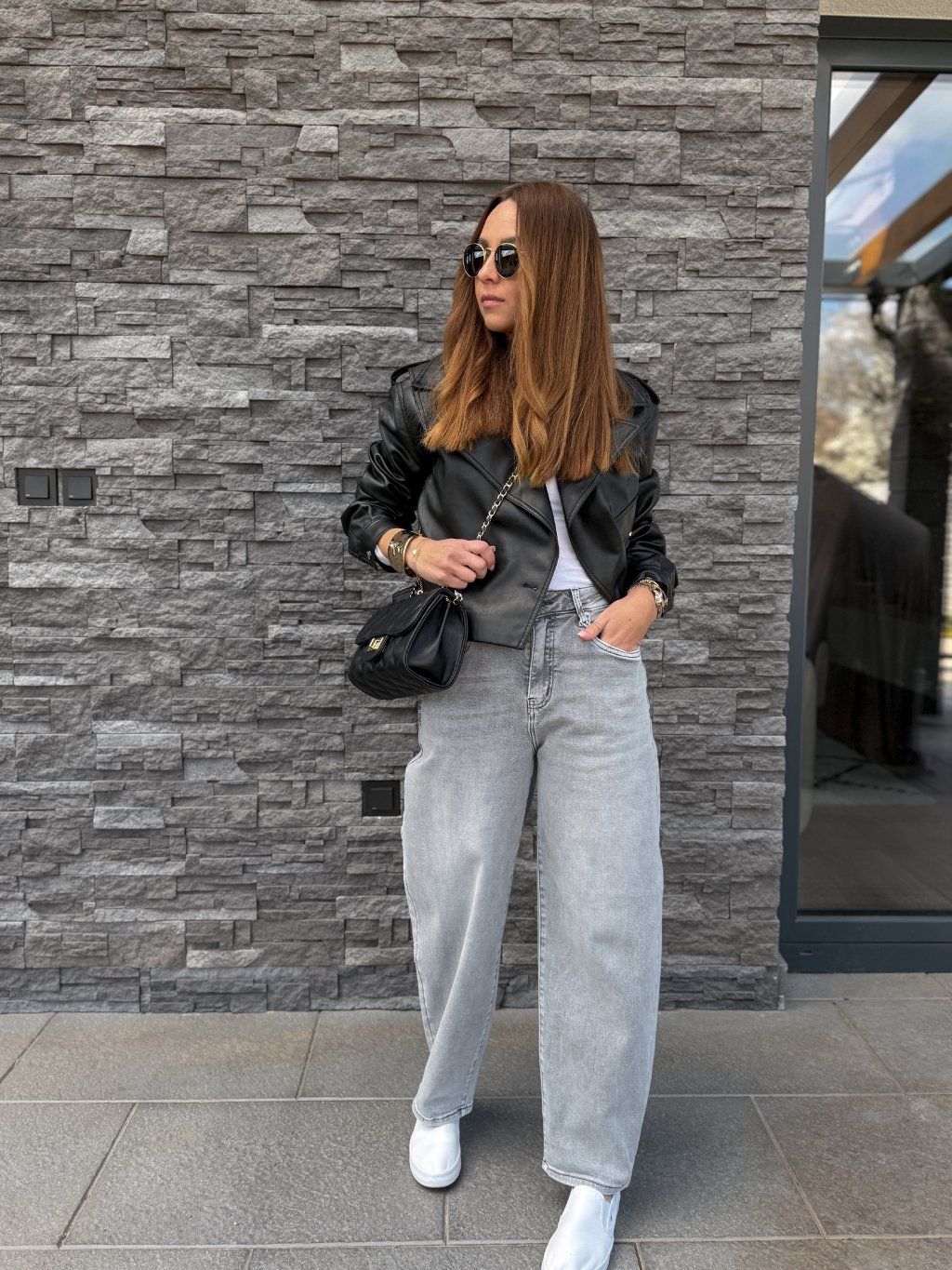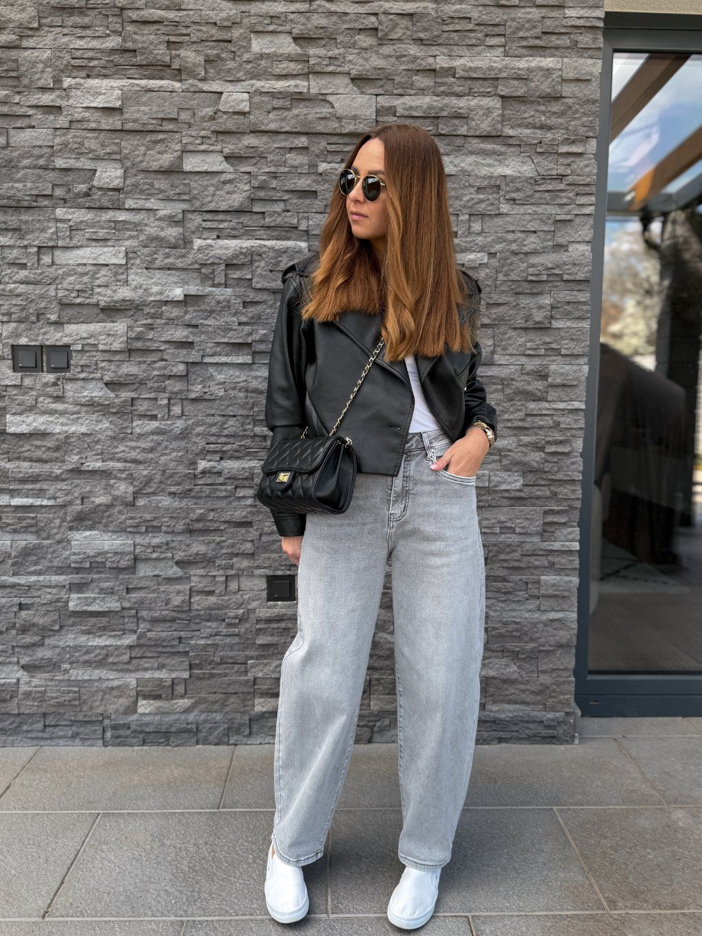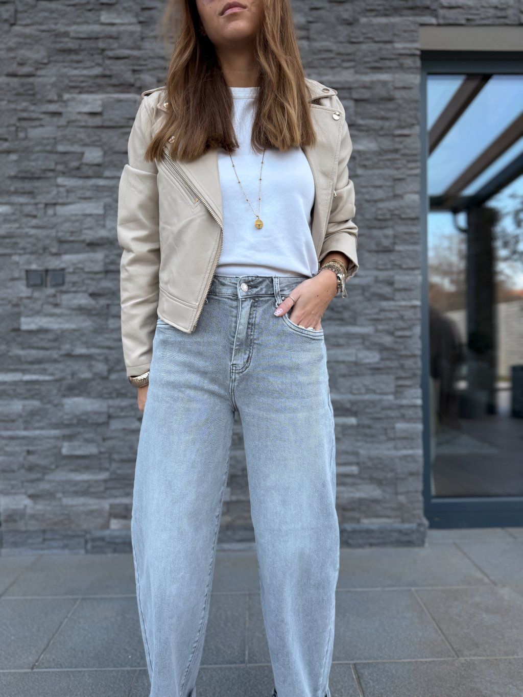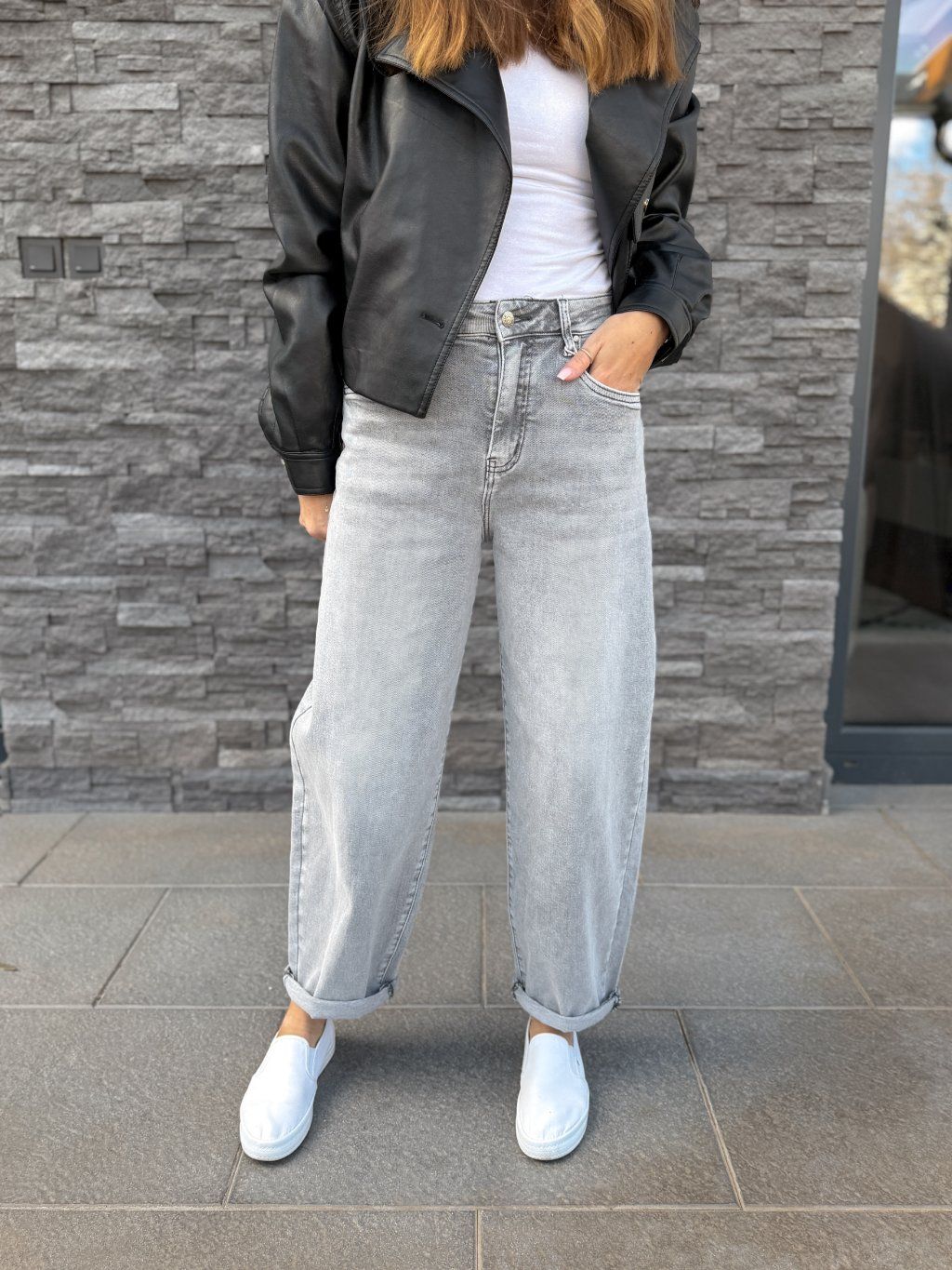Extra pohodlné, světle šedé džíny. Jsou trendy barrel střihu, mají vysoký pas.