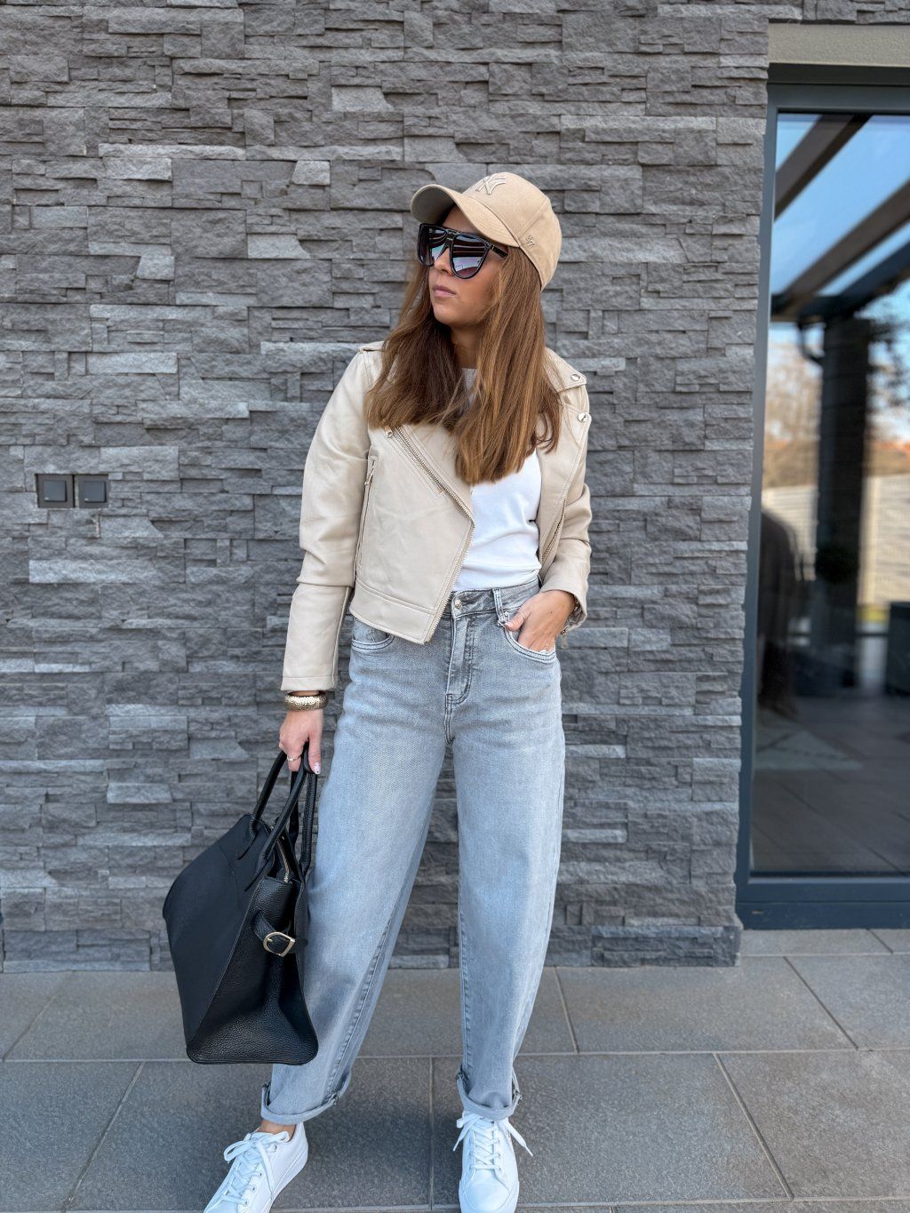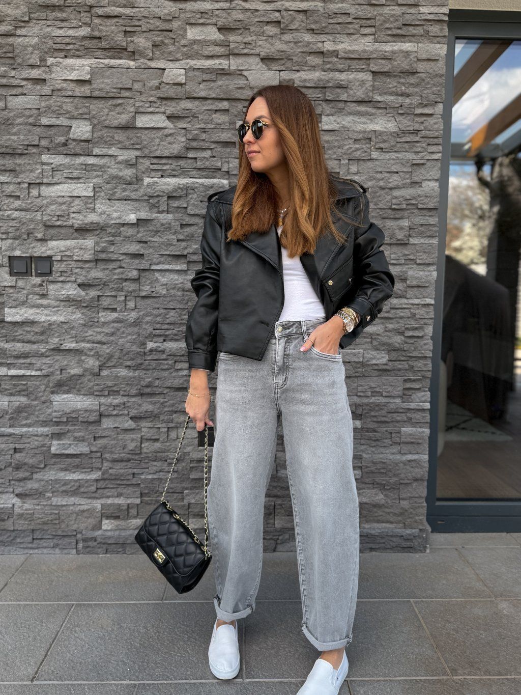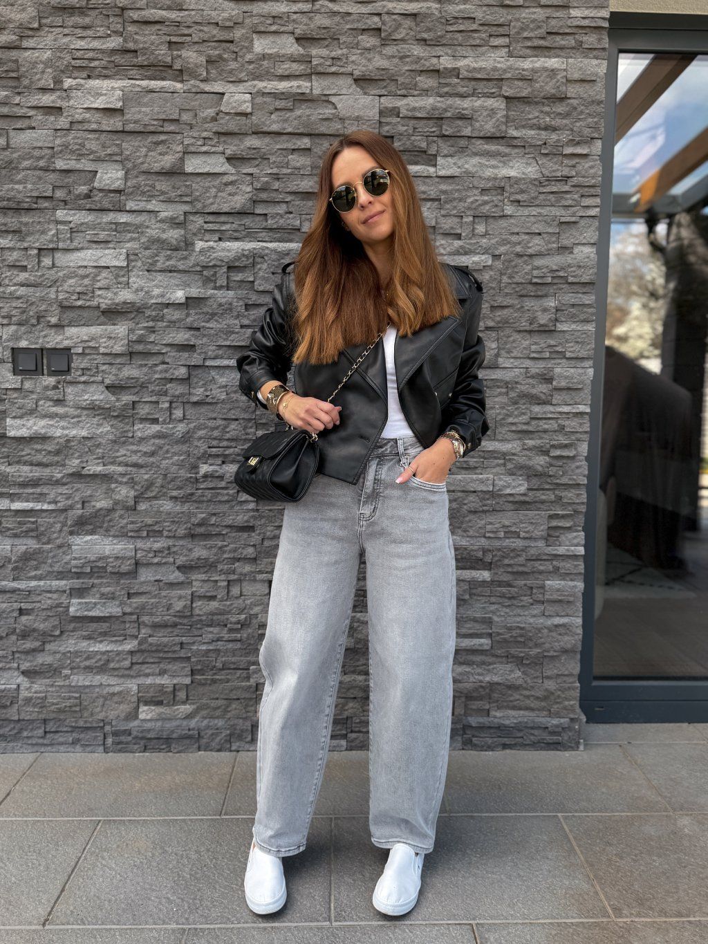 Extra pohodlné, světle šedé džíny. Jsou trendy barrel střihu, mají vysoký pas.