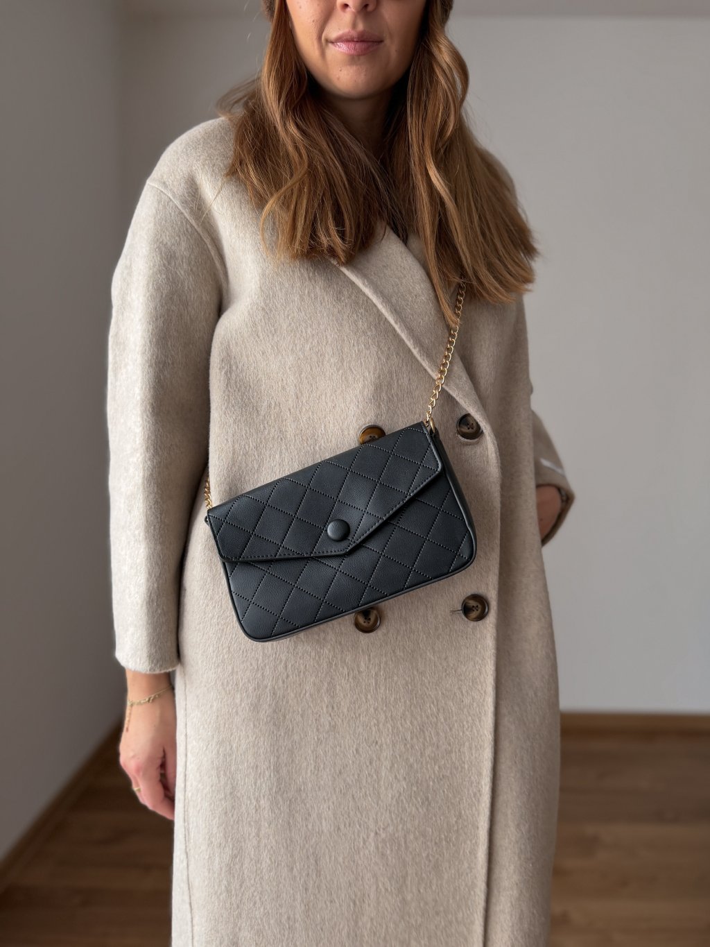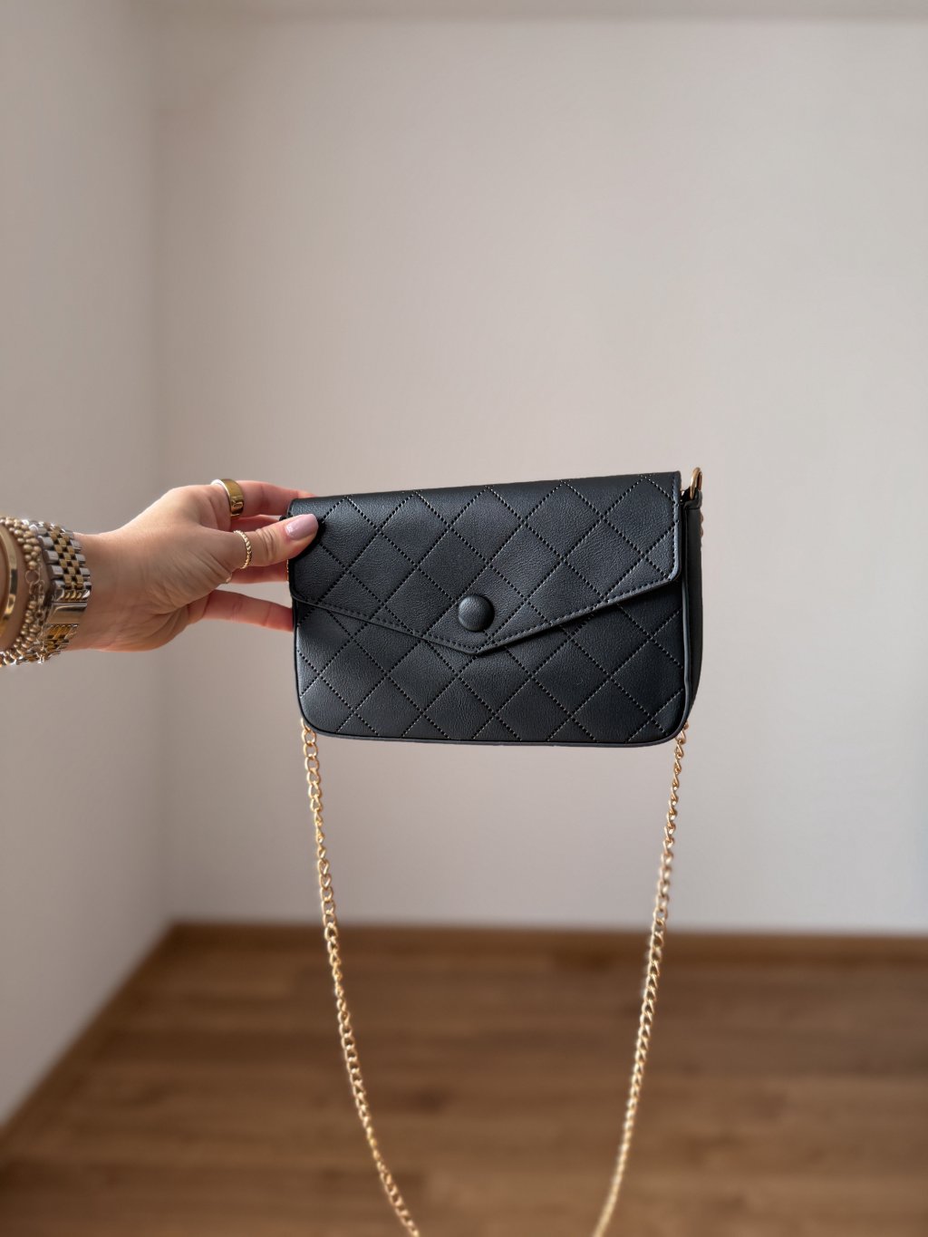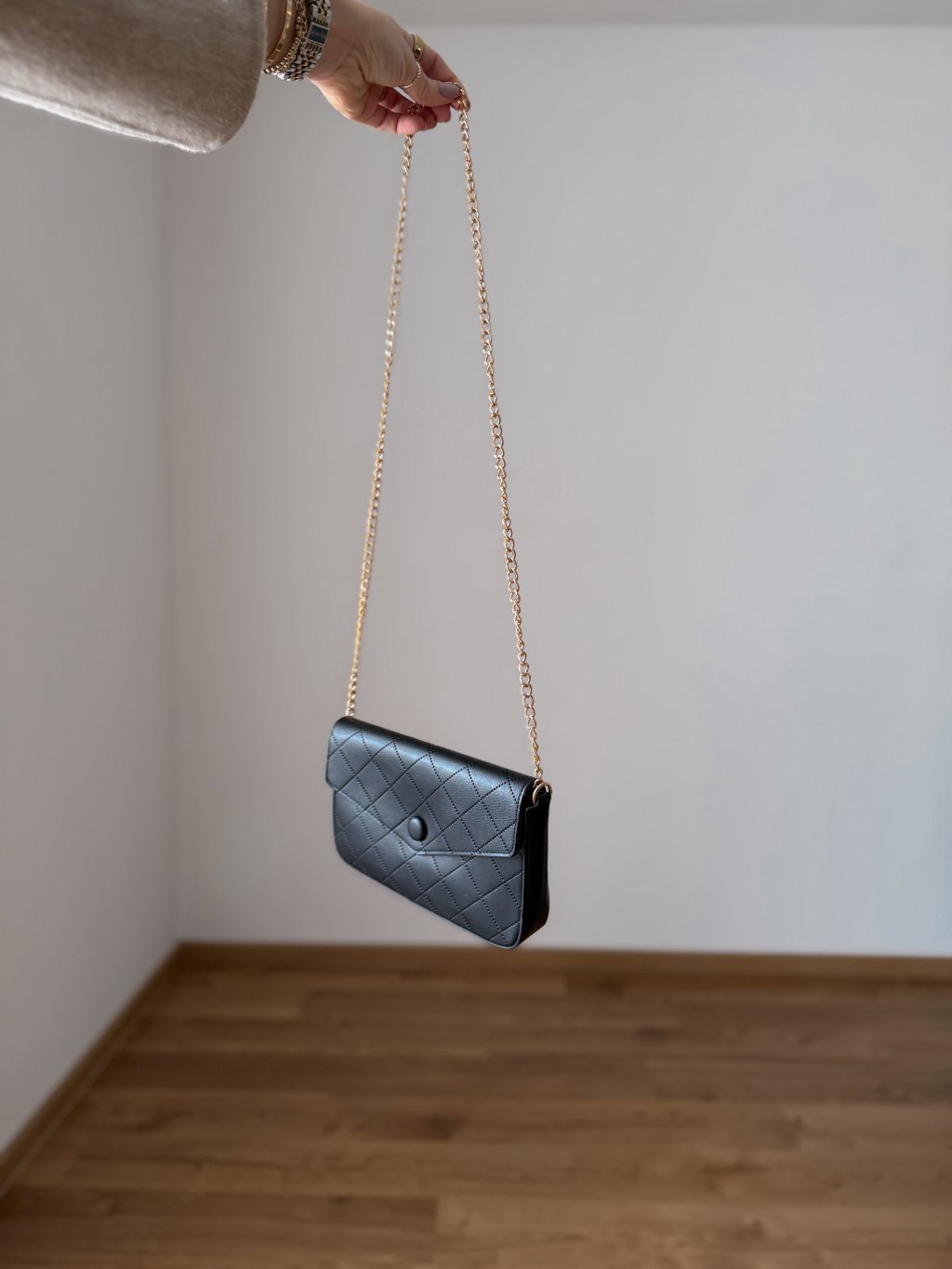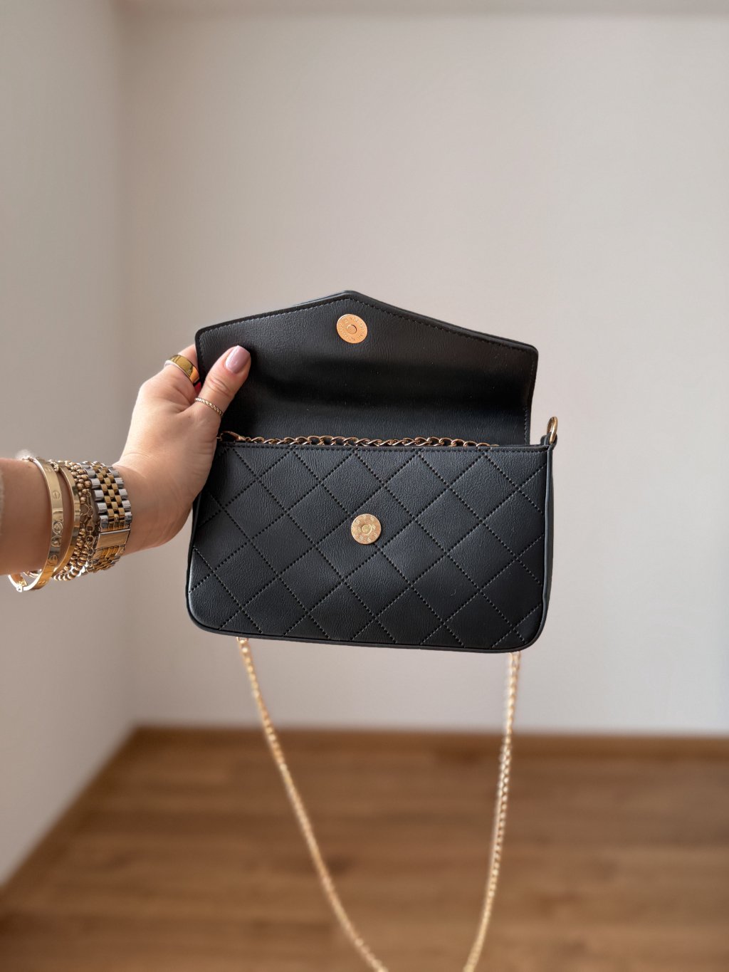 Crossbody popruh - lze schovat do kabelky, takže lze nosit i jako psaníčko.