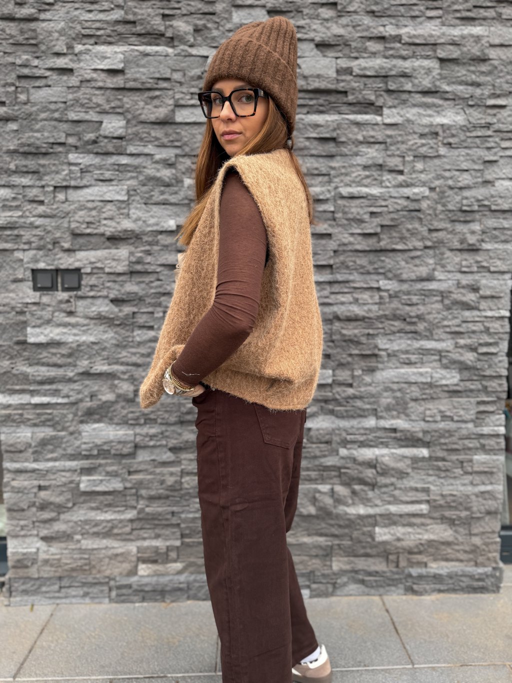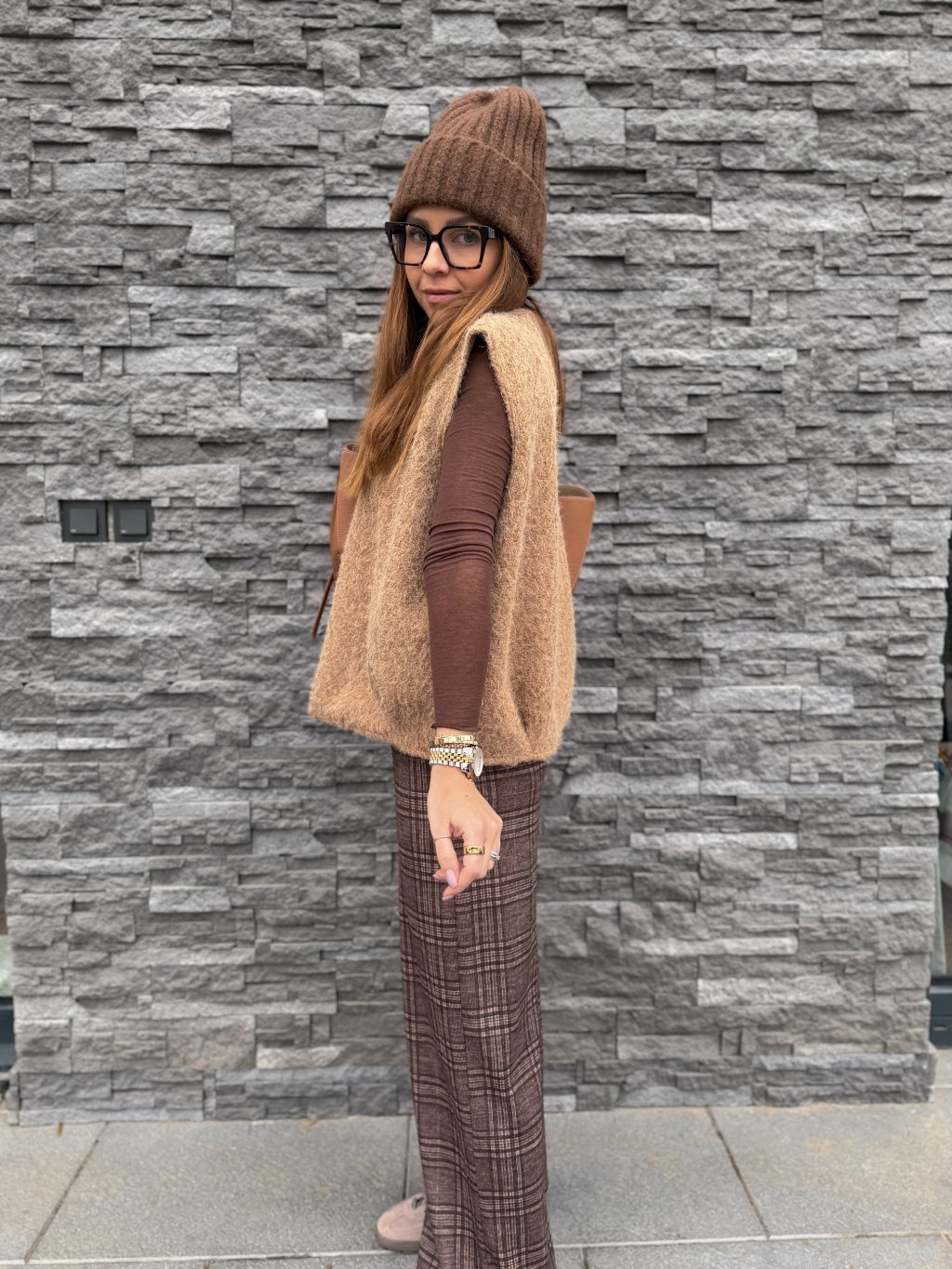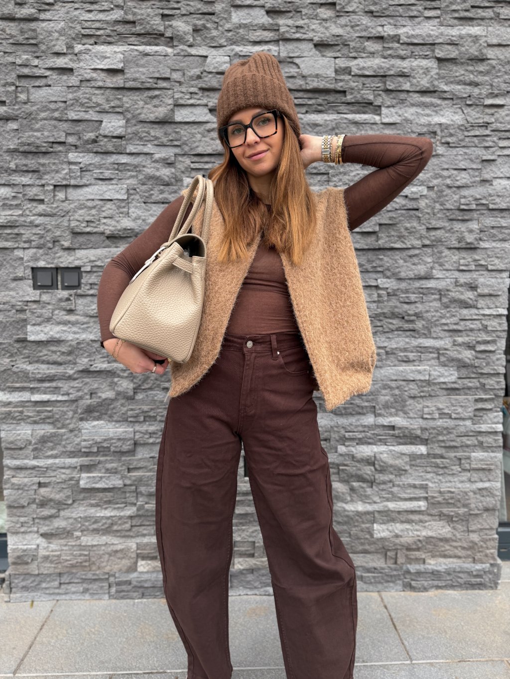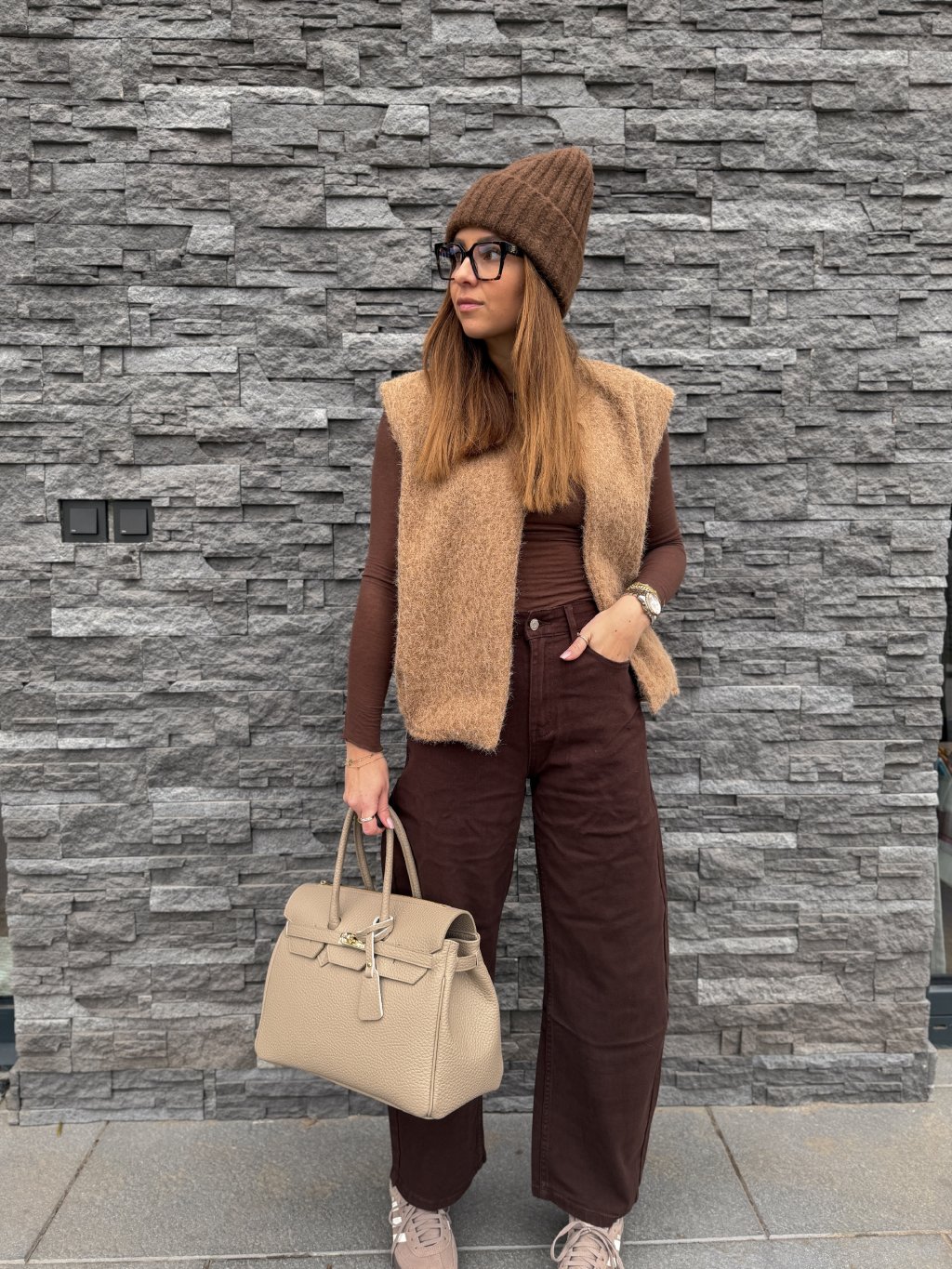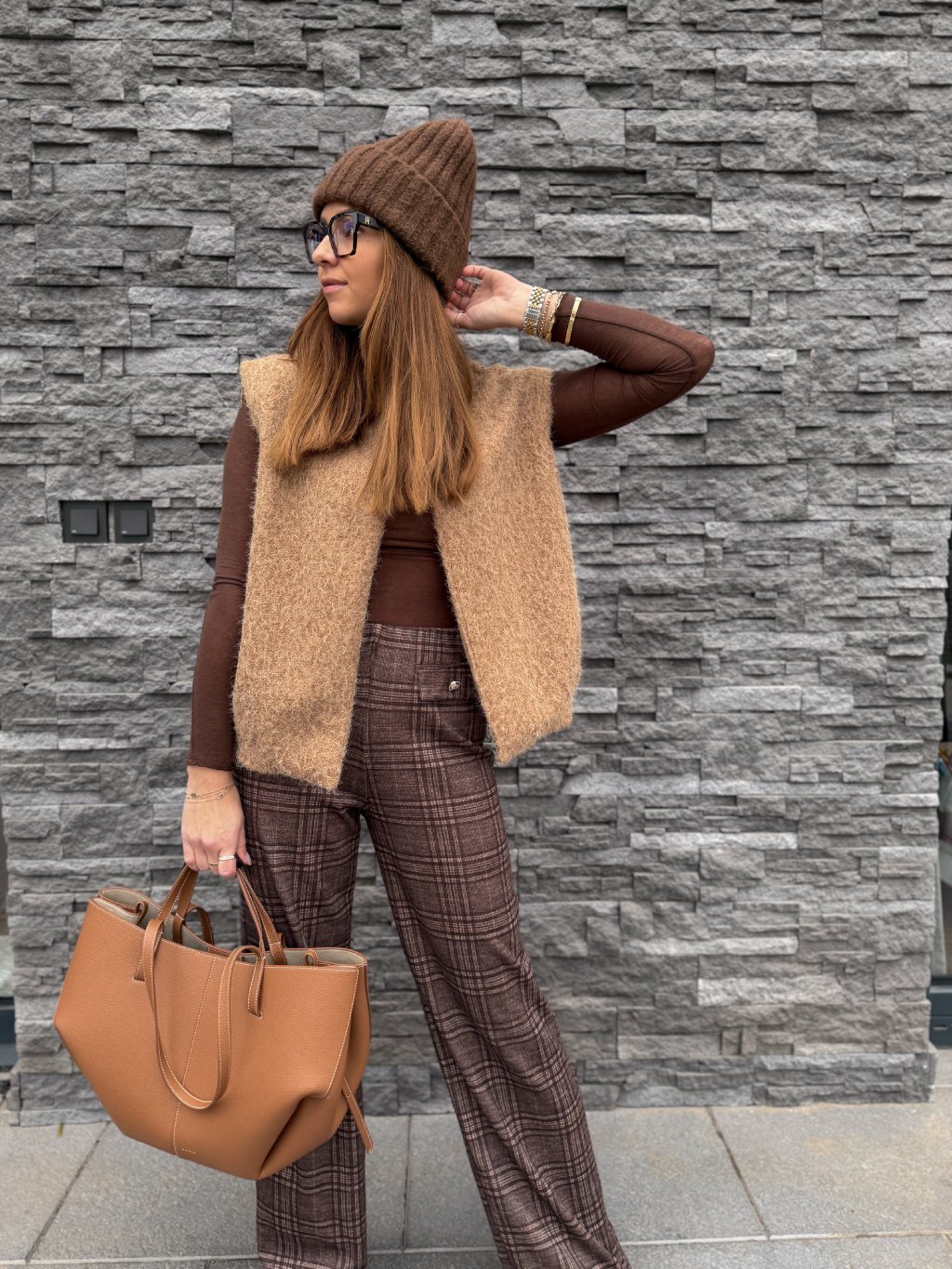 Hřejivá, beránková vesta. Vypadá bombasticky s kašmírovým topem nebo klasickou bílou košilí (tu najdeš také u nás).