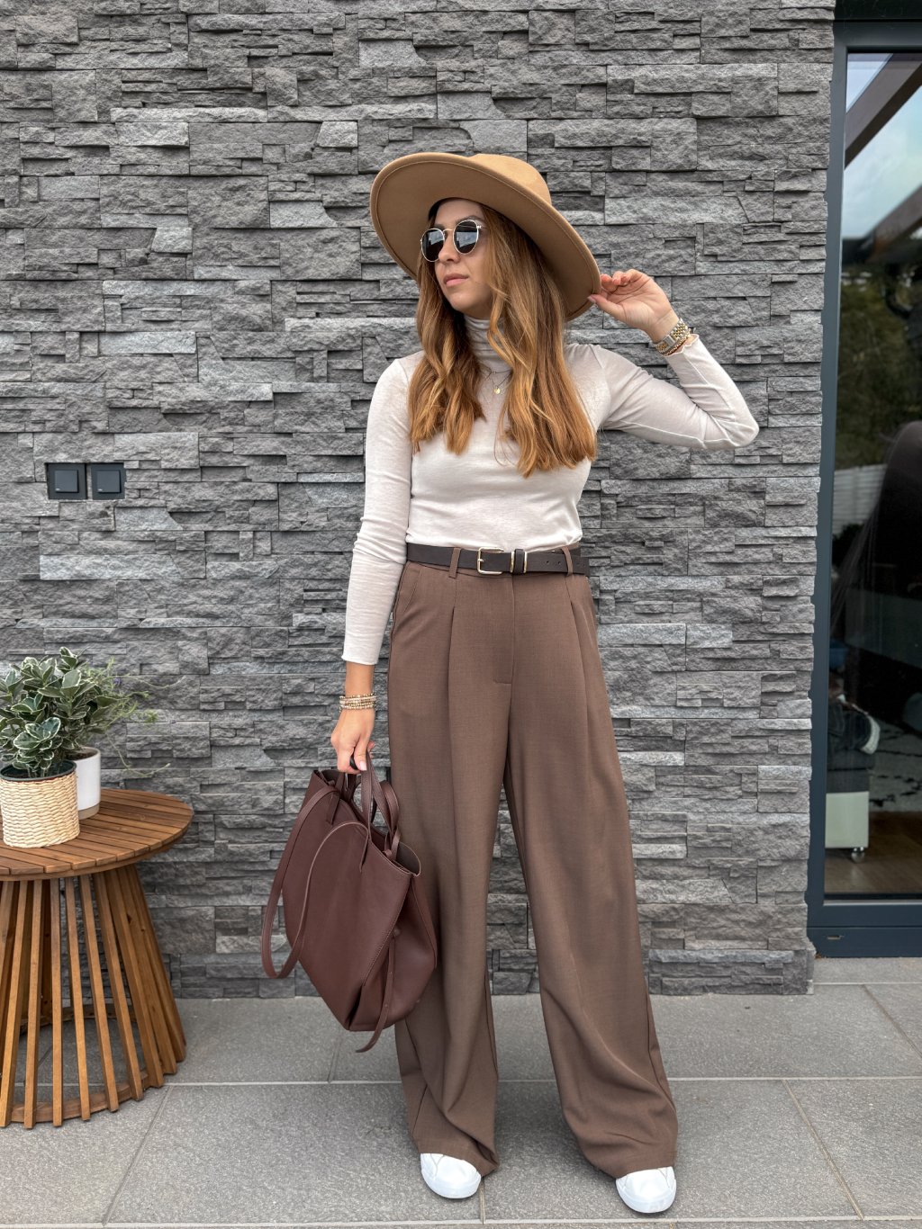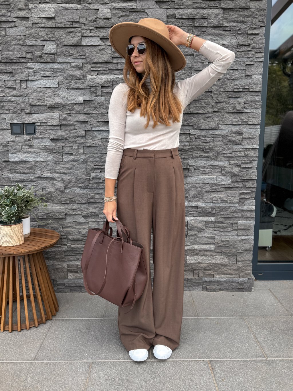 Široké, tmavě hnědé kalhoty, které jsou nadčasové.