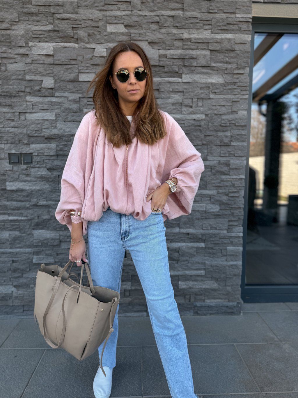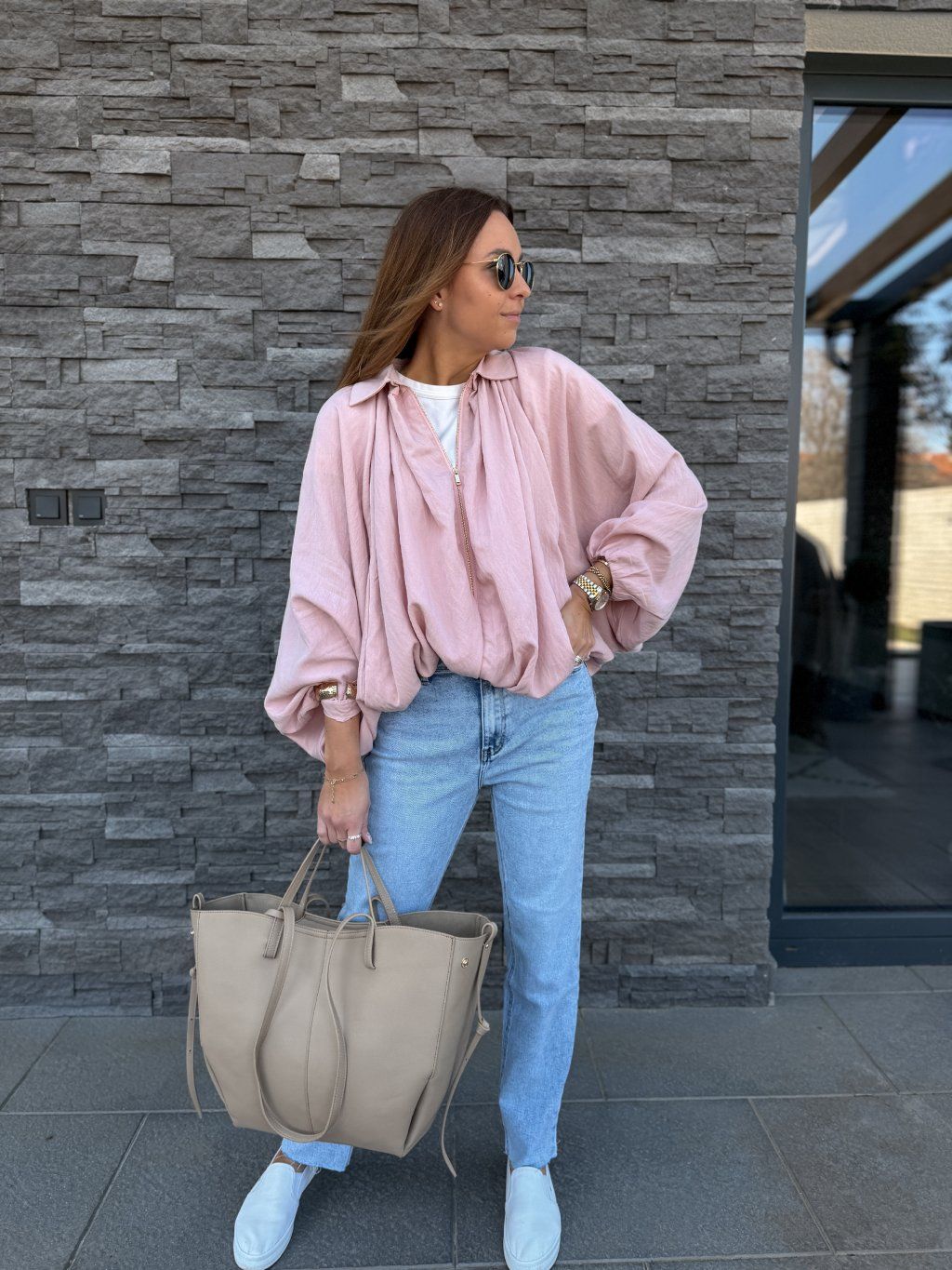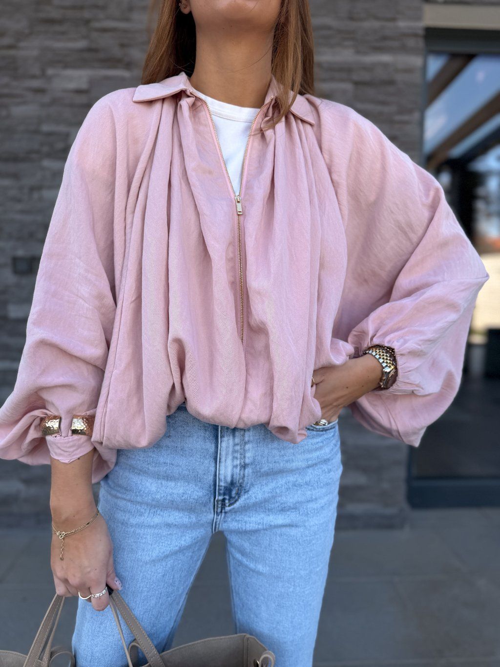 Oversized střih, široké rukávy, dole stažený do gumičky.