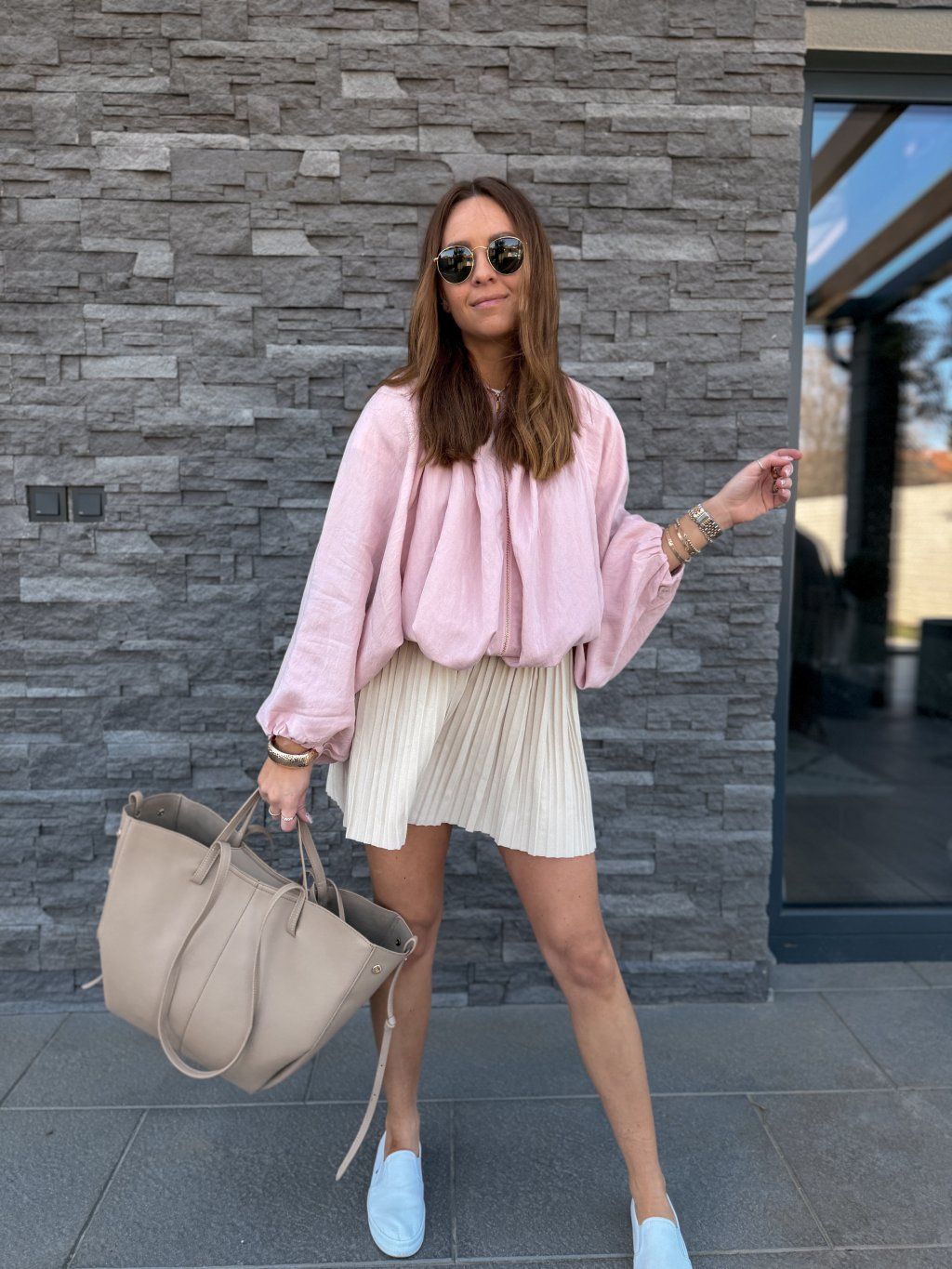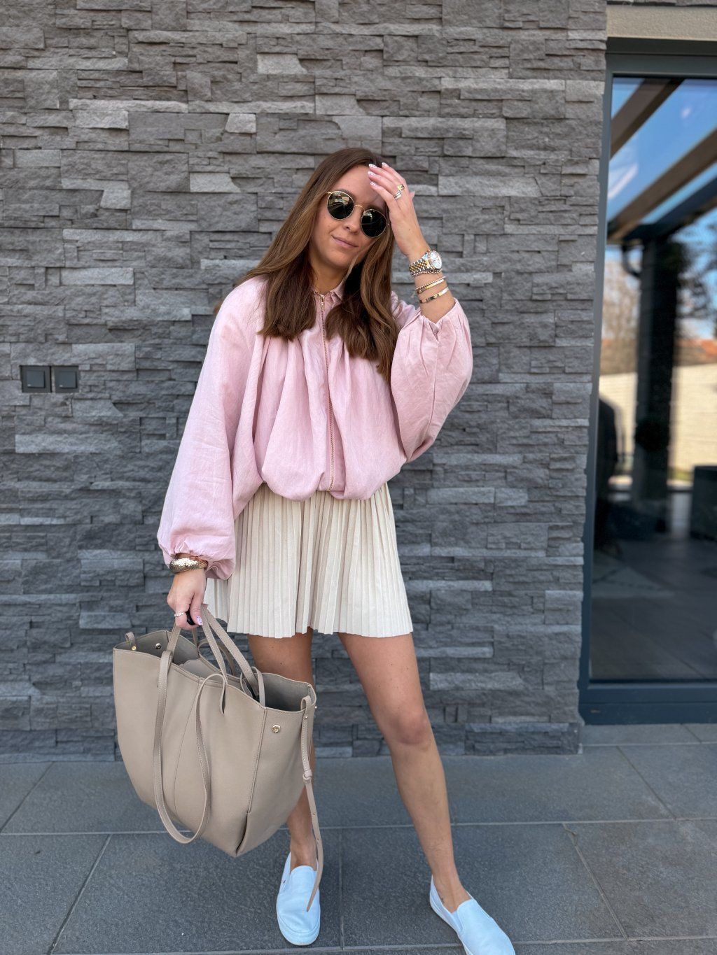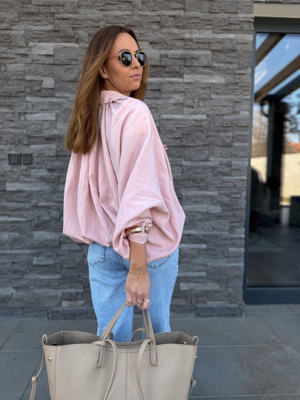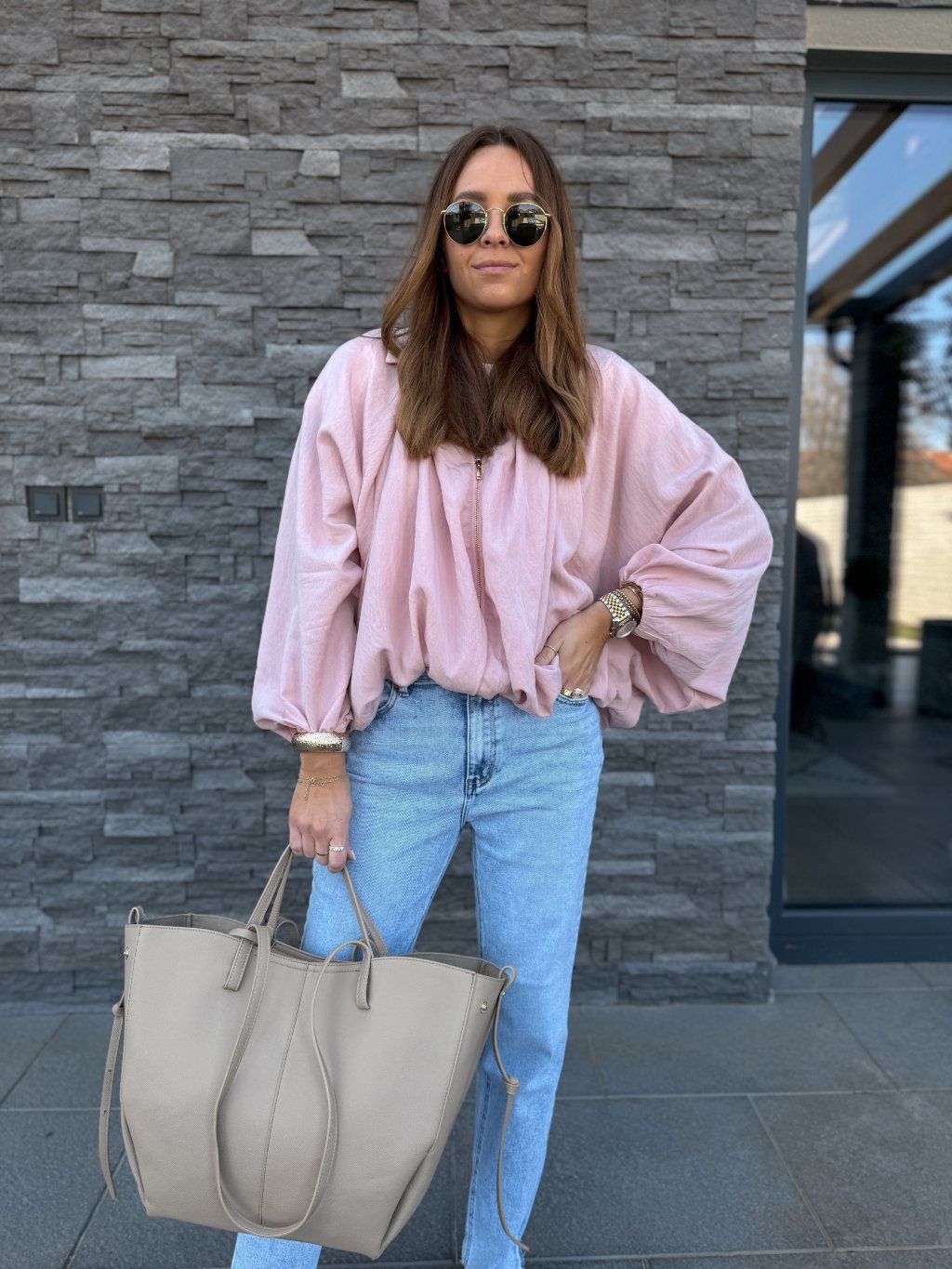 Oversized střih, široké rukávy, dole stažený do gumičky.