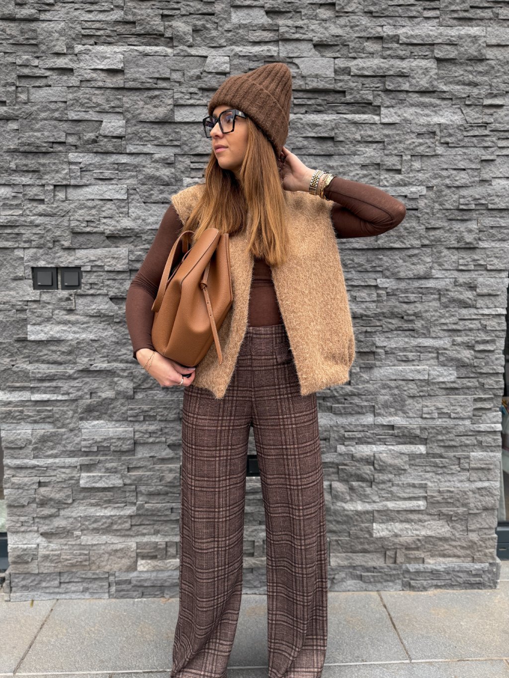 Kárované, příjemné kalhoty širšího střihu. Vysoký pas.