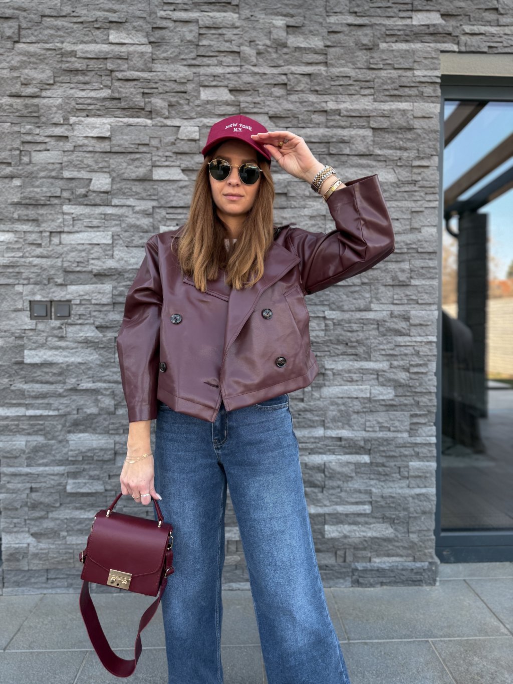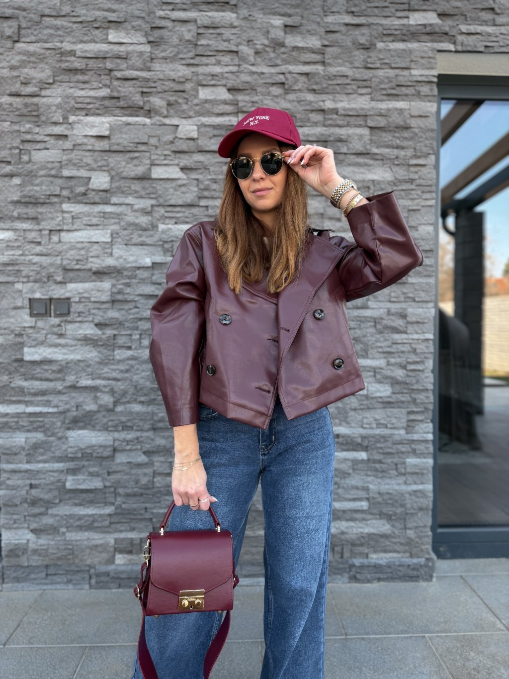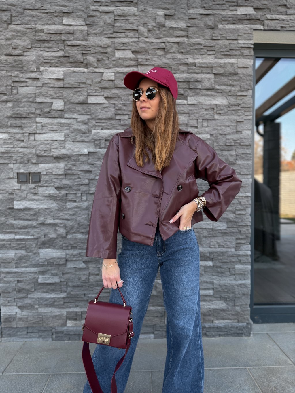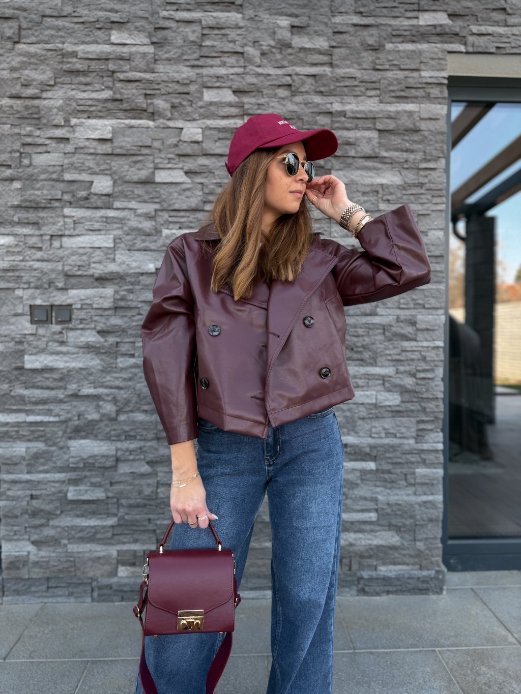 - Nádherná, koženková bunda v burgundy barvě.