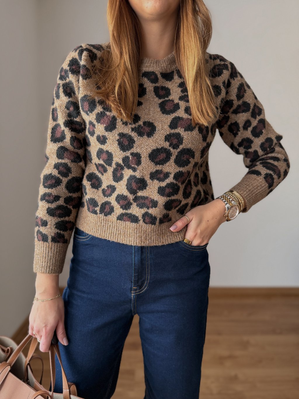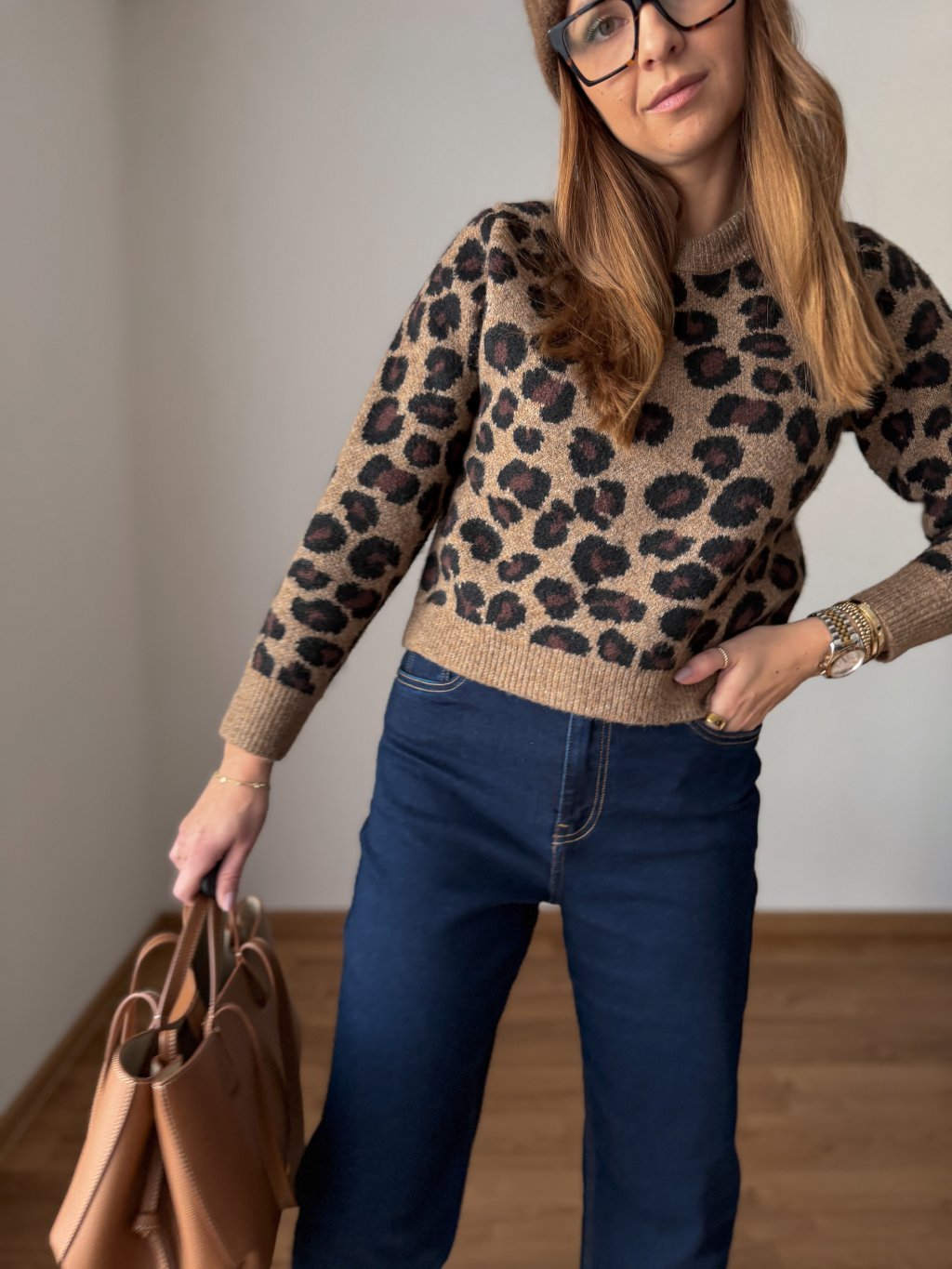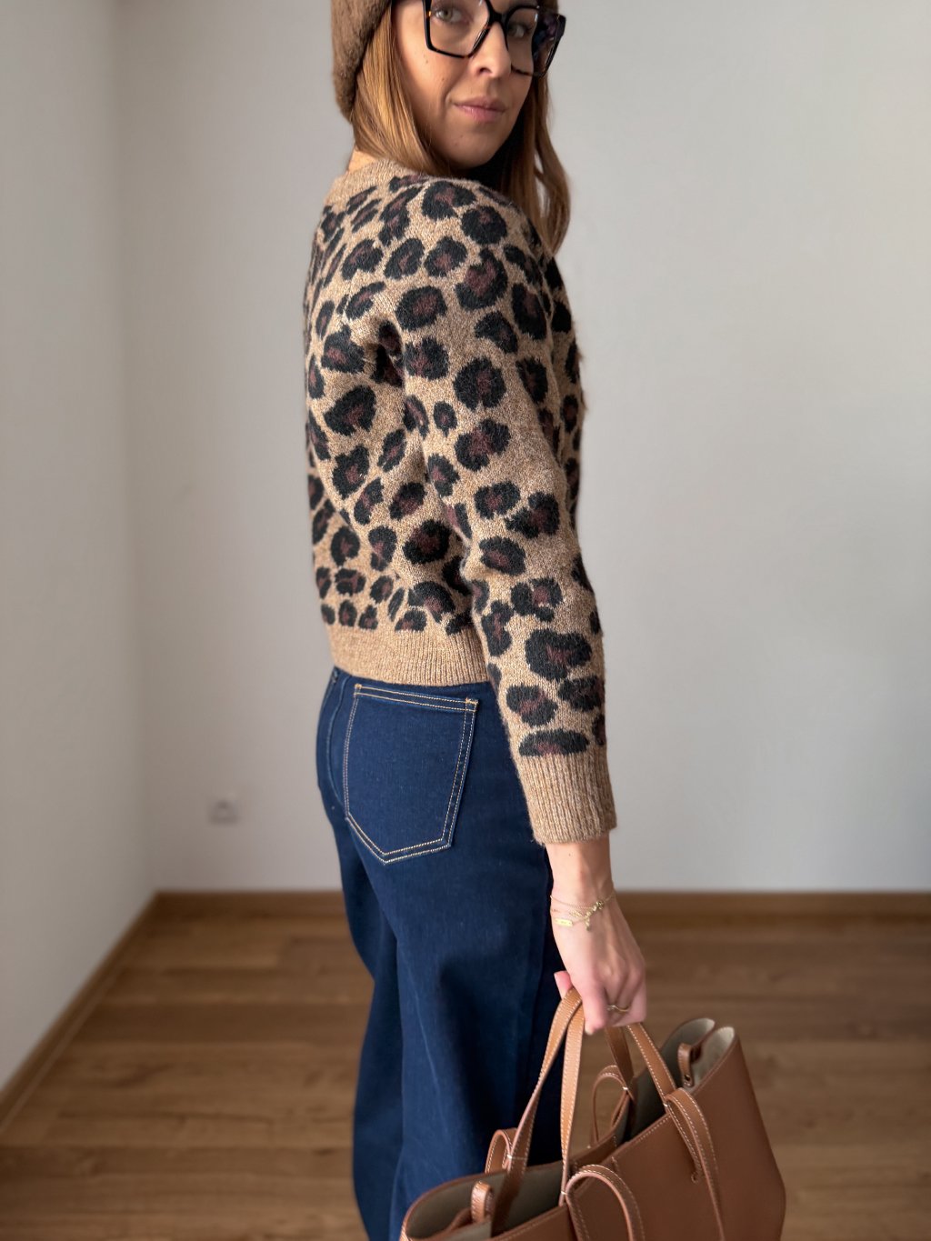 Pletený, hutný a teplý svetr s leopardím vzorem.