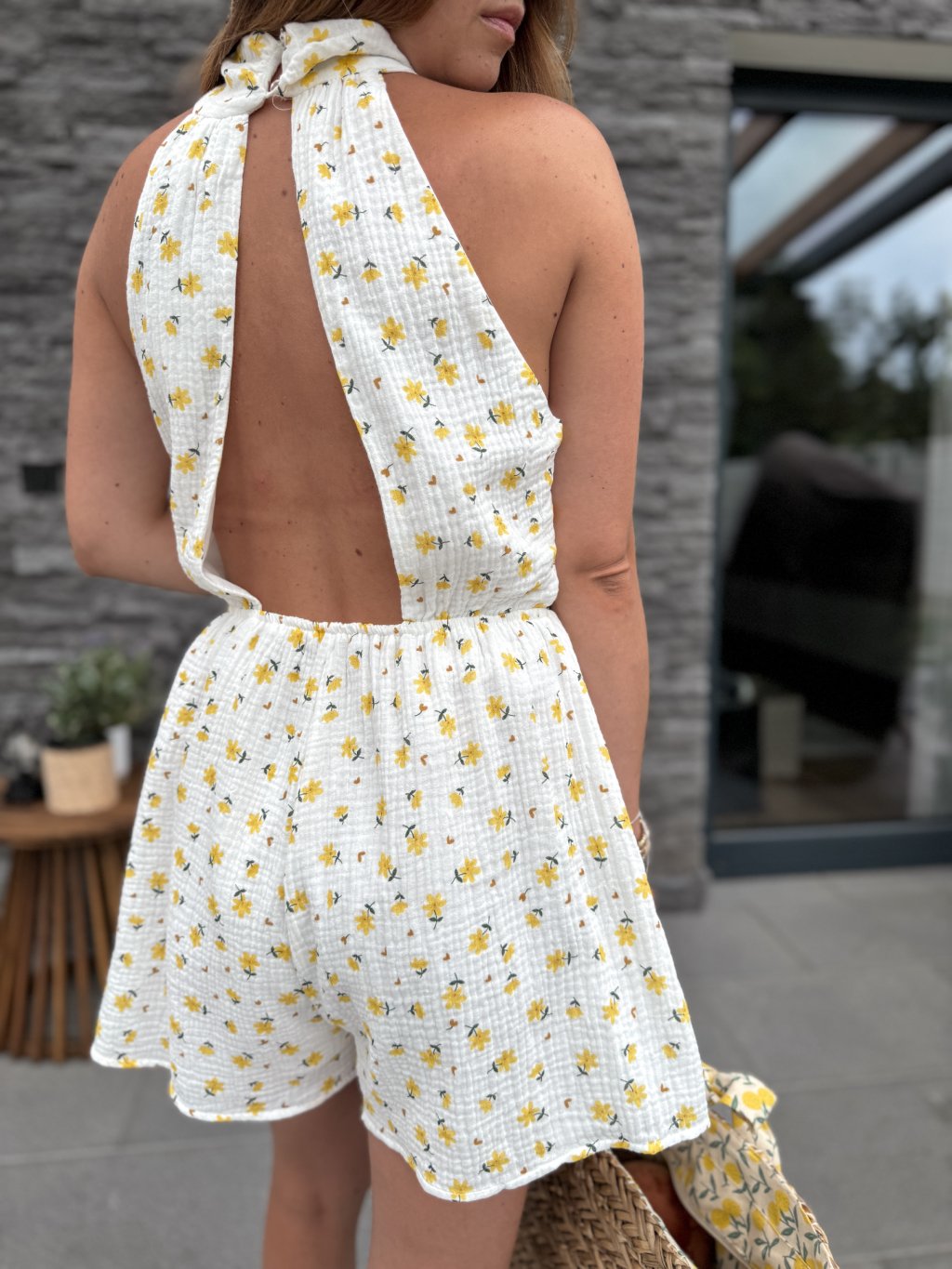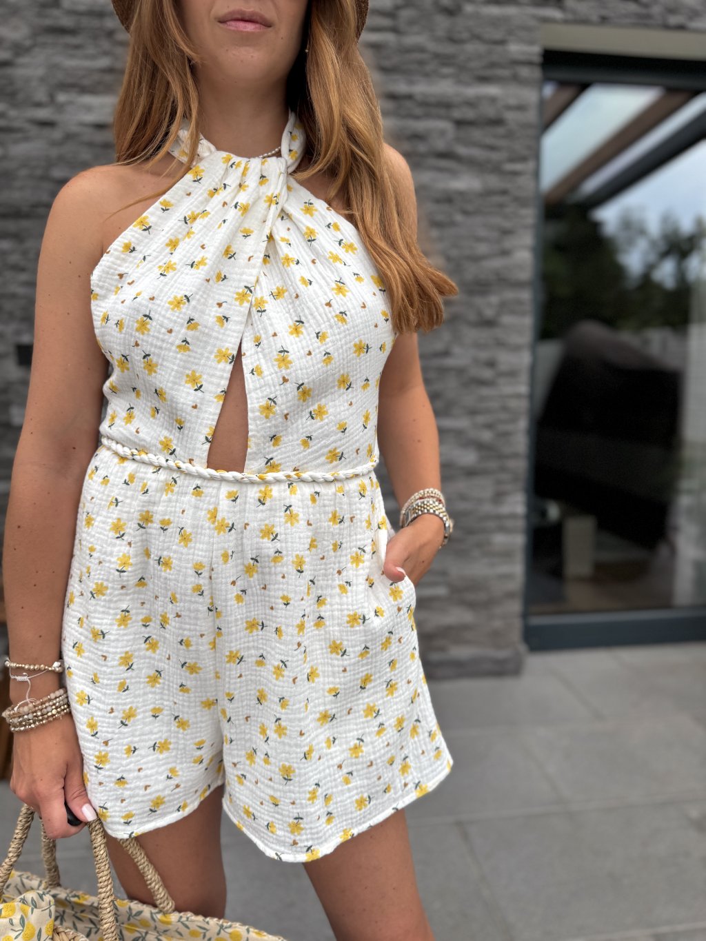 Pohodlný, mušelínový overal. Je z lehounké látky, v pase pružná guma.