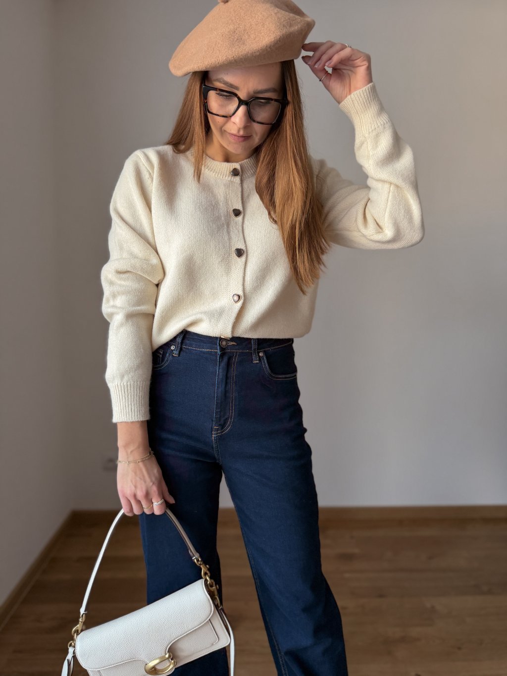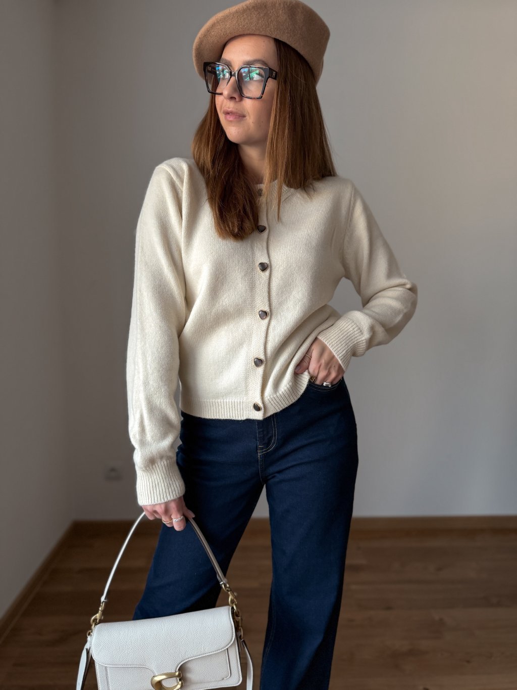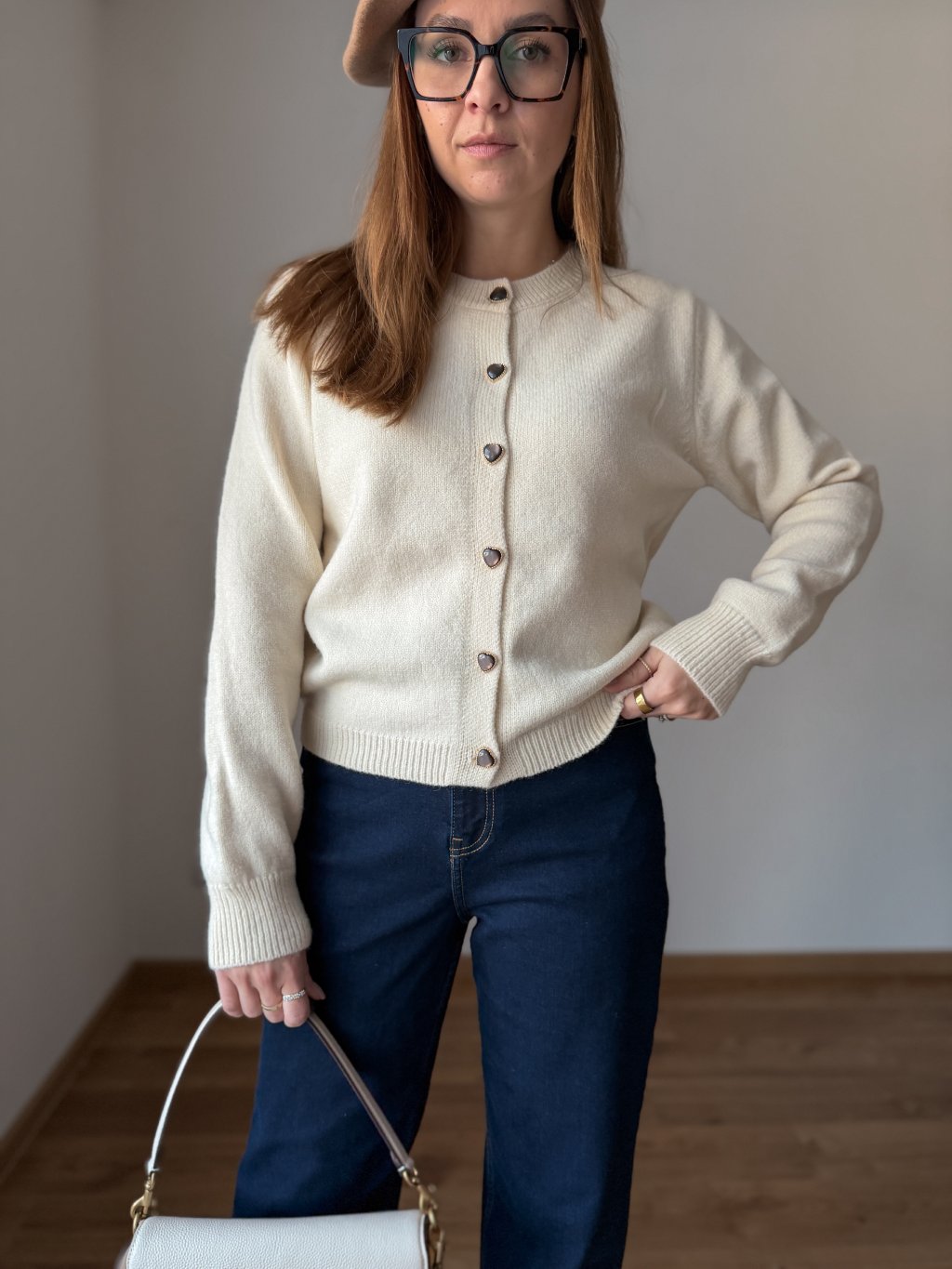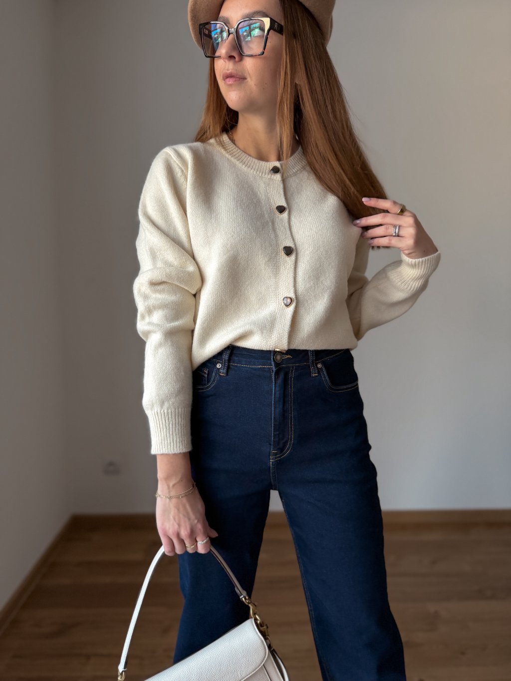 Hutný, příjemný svetřík s knoflíčky ve tvaru srdíček.